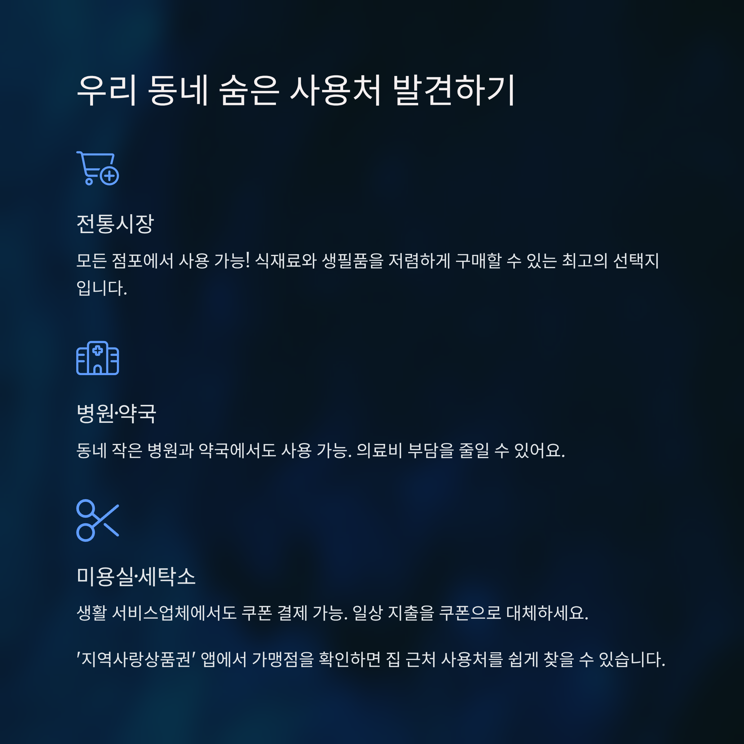 - 필수 지출 대체: 병원비나 미용실 등 생활비를 쿠폰으로 해결해요.