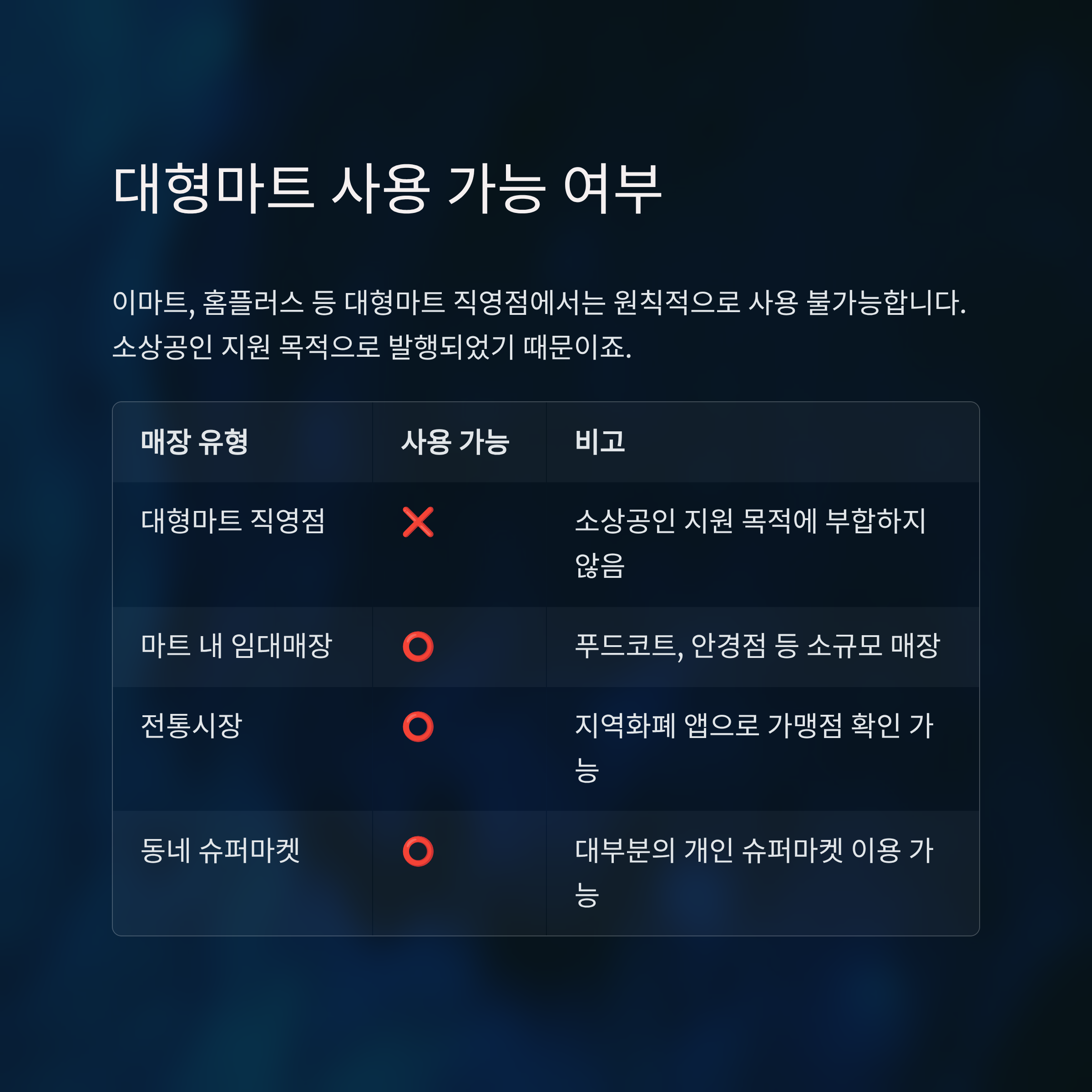 | 대형마트 직영점 | ❌ 불가 | 쿠폰 사용 목적(소상공인 지원)에 부합하지 않아요 |